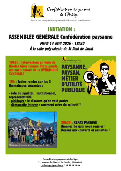 Invitation AG de la Confédération Paysanne de l'Ariège le 14 avril à St Paul de Jarrat